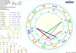 The Thema Mundi ("World Theme", with 'theme' being a word that also means chart) was a mythical horoscope used in Hellenistic astrology that shows the supposed positions of the seven visible planets (including the Sun and Moon) at the beginning of the universe.[1] It purports to exemplify the logic behind the sign rulerships, exaltations, and meanings of the aspects, among other things. The purely symbolic nature of the chart is readily perceived from the impossible positions of Venus and Mercury in it.[2] In the late Middle Ages there has been a confusion between a horoscope of the world and the thema mundi.[3]