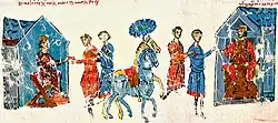 Depiction of ambassadors being sent between Theodora and Boris I of Bulgaria in the Madrid Skylitzes