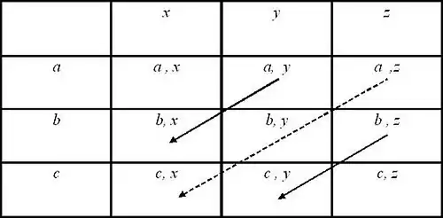 Consider two natural attributes A, and X. It is not known that either A or X is a continuous quantity, or that both of them are. Let a, b, and c represent three independent, identifiable levels of A; and let x, y and z represent three independent, identifiable levels of X. A third attribute, P, consists of the nine ordered pairs of levels of A and X. That is, (a, x), (b, y),..., (c, z) (see Figure 1). The quantification of A, X and P depends upon the behaviour of the relation holding upon the levels of P. These relations are presented as axioms in the theory of conjoint measurement.