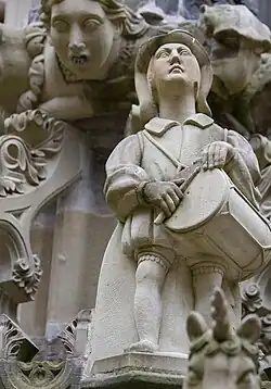 In February 1540 he made a bonnet to line the crown of Scotland which the goldsmith John Mosman had recently refurbished. The bonnet was made of purple velvet and lined with purple satin.[17] Thomas Arthur worked in Edinburgh and would bring the clothes to the king at his palaces. His servants brought clothes to Stirling Castle in March 1540 and were given a reward or tip recorded as "drinksilver".[18] At Easter 1541 he brought a coffer of clothes to Stirling Castle, including a black Venice satin doublet with gold buttons, and black hose. He also delivered new clothes to the King's servants, including the pursemaster John Tennent who would "deliver them where the king commanded".[19]