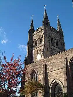 The Church of St Editha, Tamworth had been an important collegiate church in the Middle Ages but the college was abolished in the reign of Edward VI.[8] The prebends and advowson were sold off by Elizabeth I in 1581. From 1583 patronage of the church and vicarage belonged to the Repington family. However, Elizabeth's charter of 1588 introduced inconsistencies, leading to disputes, by granting the right to appoint a preacher and two other ministers to the corporation of Tamworth, in their capacity as guardians of Tamworth Grammar School.[9] The preacher was to receive an income of £20 per year and the other ministers £16: they were also allocated a house and garden in the town. Although the Repingtons and the corporation could not agree in principle, they accepted a working compromise by which the family appointed the vicar and the town the assistant ministers. John and Margaret Repington appointed Samuel Hodgkinson vicar of Tamworth in 1610 and he survived in post until 1629.[10] It seems that Blake must have been the preacher appointed by the council, as his licence to preach dates from the period of Hodgkinson's incumbency as vicar. John Repington died in 1626 and was succeeded by a son and namesake, who appointed Blake vicar on 12 November 1629. The corporation also granted him the two curacies or assistant ministries, giving him complete control of the large parish. He took up residence in the old college house. However, Katherine Clifton, 2nd Baroness Clifton had long maintained a claim to the advowson and the old college property, based on rights that pre-dated the abolition of the college.[11] She sold on her claim and it was bought around 1639 by William Comberford, a former High Sheriff of Staffordshire. On 4 May 1642 he served Blake with a process out of the Court of King's Bench for occupying the property without his permission. The case was to come to nothing in itself, although Blake and Comberford were soon on opposite sides in a wider conflict.