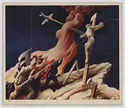 During World War II, Benton created a series titled The Year of Peril, which portrayed the threat to American ideals by fascism and Nazism. The prints were widely distributed. Following the war, Regionalism fell from favor, eclipsed by the rise of Abstract Expressionism.[41] Benton remained active for another 30 years, but his work included less contemporary social commentary and portrayed pre-industrial farmlands.