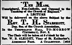Sparshott was a vocal antagonist against the Oxford Movement, and he gave lectures on the subject. In November 1890 he spoke strongly at a Church Association meeting, saying that "the Evangelical party ... were in very great danger of the bishops" of the Oxford Movement.[39] In October 1893 he gave a lecture described as being "on priesthood", in Sheffield.[40] On 1 November of the same year, his lecture in Northampton was announced as The Mass, Unscriptural, Non-Catholic and Opposed to the Teaching of the Church of England.[41] Sparshott repeated the lecture to a "not very numerous" audience in Southampton on 22 November.[42] As organising deputation secretary of the Church Association, he published a letter in the Grantham Journal in 1897 on the definition of "priest". He said that instead of priests being sacrificers of masses for the dead, as they were before the Reformation, as Anglicans they were now just presbyters, or evangelists.[43] This gave rise to some controversy.[44] In the same vein, in 1901 in Staines, he gave a lecture titled, Ritualism, the Highway to Rome, saying that the Bible, not ribbons on clerical robes, was the source for his beliefs.[45] At a Church Association meeting in Rugby in November 1893, Sparshott spoke on the subject of the dispute between the English Church Union, whom he called "ritualists", and the Church Association.[46]