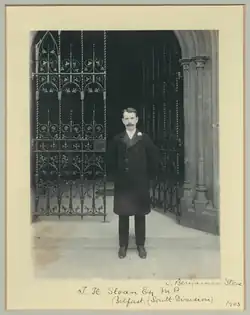 In July 1902, the sitting MP for South Belfast, William Johnston, died. Johnston, an evangelical Orangeman, was first elected in 1868, defeating a millowner as the candidate of the United Protestant Working Men's Association of Ulster.[2] While he later sat unopposed as an official Conservative, he established a reputation as a supporter of labour protection, tenant right, the secret ballot and woman's suffrage[3][4][5]