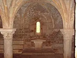 During the reading of the Rule and discussions, the monks were seated upon wooden benches, and the Abbot was seated at the east, facing the entry. The main sculptural element is a simple cross of the order on the south column, before which the monks would bow briefly. A hand holding a cross, the symbol of authority of the abbot, is sculpted on the capital of the north column. He was sometimes buried in this room, so that after death his memory would add to the authority of the living abbot.