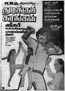 Thudikkum Karangal (transl. Shivering hands) is a 1983 Indian Tamil-language action drama film written and directed by C. V. Sridhar, and produced by K. R. Gangadharan.[1] The film stars Rajinikanth and Radha, while Jaishankar, Sujatha, Vijayakumar and Y. G. Mahendran play other supporting roles. The soundtrack was composed by S. P. Balasubrahmanyam, who made his debut as composer with this film in Tamil. It was average at box-office.[2]