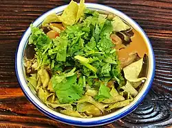 A snack of strong local flavor, Guobacai is a sort of pancake made of millet and mung bean flour. The pancake is sliced into linguine-like noodles and cooked in the sauce made of sesame oil, chopped ginger, soy sauce, preserved beancurd and green onions. Guobacai is often served along with fried dough and sesame cakes for breakfast.[10] |
