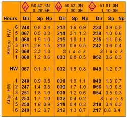 Either somewhere on the chart (generally on land) or else on a separate sheet, will be a Tidal Diamond table. This contains a grid of thirteen rows and three columns for each Diamond. The rows are the hours of the tidal cycle showing the 6 hours before high water, high water itself and the 6 hours after high water. It is important to realise that the tidal hour lasts from half an hour before the nominal time to half an hour after. For instance the row for 3 hours after high water is valid from HW+2½ to HW+3½, not from HW+3 to HW+4.[2] The columns show the bearing of the tidal stream and its speed, in knots, at both spring tide and neap tide. The times on the table are related to the high water of the standard port displayed on the table. To calculate the rate at an intermediate tide between neap and spring, interpolation is required. Traditionally this has been done using a "calculation of rates" chart.[3]