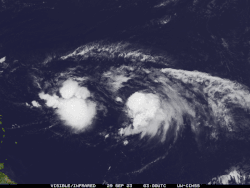 Infrared satellite loop of tropical storms Philippe (left) and Rina (right) early on September 29
