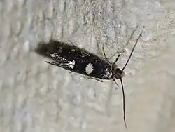 The wingspan is about 10 mm. The forewings are dark purple fuscous with two or three minute whitish strigulae on the costa towards one-third, a spot of white strigulation in the middle of the costa, a smaller spot at two-thirds, and three dots between this and the apex. There is a clear white triangular spot on the dorsum before the middle, reaching nearly half across the wing and a spot of whitish strigulation on the dorsum before the tornus, and two or three whitish scales towards the termen. The hindwings are dark purple-grey.[4]