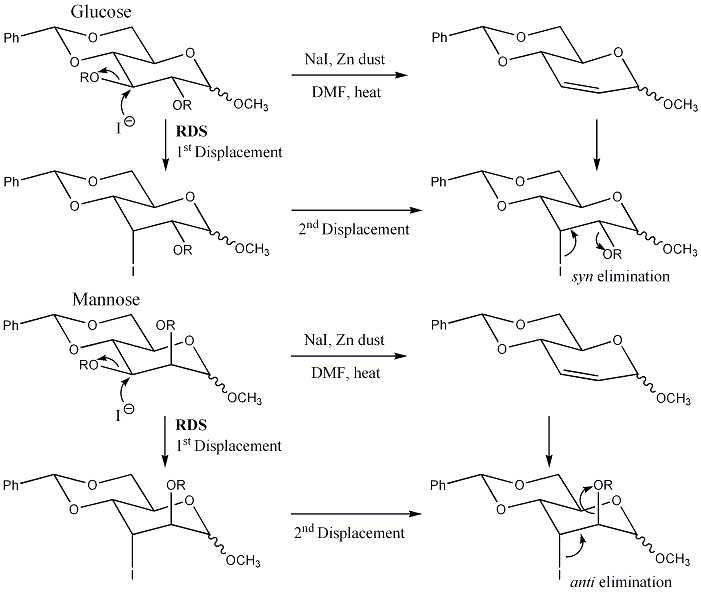 Scheme 1: Syn elimination occurs with the glucopyranosides. Galactopyranosides follows a similar syn mechanism.[3] Whereas, anti elimination occurs with mannopyranosides.[4] Note that R could be a methanesulfonyl CH2O2S (Ms), or a toluenesulfonyl CH3C6H4O2S (Ts).