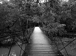 Tishomingo State Park offers visitors seven hiking trails that range in length from ¾ to 3 miles and in difficulty from easy to moderate.[12] The trails feature scenic natural springs, waterfalls, rocky creeks and streams, cliffs, rock walls and huge outcrops.[13] The terrain suggests mountains, and indeed this is a part of the Appalachian range, but the hills here are no higher than about 660 feet.[8] Rock climbing, which requires a helmet and a permit attainable at the park office, is a popular activity on the trails, particularly at the formation known as Jean's Overhang.[13] Bear Creek can be explored via canoe float trip.[14]