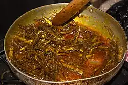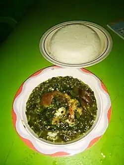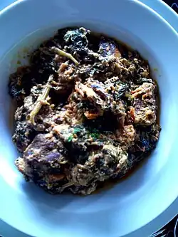 • Gbékui déssi: thick leafy greens sauce (gboma, amaranth, Cleome gynandra) with meat or fish [6]