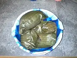 • Kom (Dokounou): steamed balls of precooked, fermented whole-grain maize dough wrapped in corn husks; served with fried fish and a special roasted chili pepper (yébéssé fionfion). Kom is widely eaten in Ghana among Ewe people, known as Kenkey in the Ga people language.