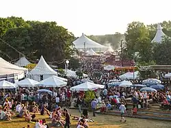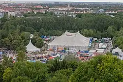 The summer festival extends over 25 days in June and July and takes place in the southern Olympiapark. These include 50 dining establishments and over 200 stalls selling handicrafts. At the beginning only the part between the East-West Peace Church and the Spiridon-Louis-Ring was used. There is a theater and performance program and performances from international musicians. Performances so far at the festivals include those from Miriam Makeba, Lou Reed, Roxette, Bob Dylan,[4] Kris Kristofferson, Milow, Amy Macdonald, Angelo Branduardi, Hubert von Goisern, Hans Söllner, Hannes Wader, Konstantin Wecker, Gary Moore, Joan Baez, Wolfgang Ambros, Marianne Faithfull, Manfred Man, Jethro Tull, Foreigner, Toto, BAP and Emerson, Lake & Palmer.[5] Due to noise control reasons, the live music events usually end by 11 pm. The discos are equipped with limiters.[6]