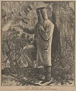 Carrington's article 'Catching the Kellys: A Personal Narrative of One Who Went in the Special Train' was published in The Australasian on 3 July 1880, describing his journey by train to Glenrowan, the siege and capture of Kelly and the burning of the inn.[34] His illustrations, based on sketches made at the scene, were published in the July issue of The Australasian Sketcher, featuring a drawing on the cover of Ned Kelly in his armour, one leg propped upon a fallen log, firing at the police with his revolver. Carrington's detailed drawings also included depictions of Kelly's armour, Ned Kelly lying on the bunk in the station-master's house, the general scene at night of the besieged inn and the bodies of gang members Joe Byrne on the floor of the inn and Dan Kelly and Steve Hart engulfed in flames.[35] Carrington's written descriptions and published images of the events at Glenrowan have proven to be highly influential and "underpin the way Ned Kelly is remembered in Australian history and cultural mythology".[17][B]