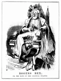 A cartoon by Carrington published in Melbourne Punch in November 1869, titled 'Rogers Rex; Or, The King of the Colonial Islands', was described by the historian Marguerite Mahood as an early satirical work prefiguring Carrington's later reputation as "the acknowledged 'fighting cartoonist' of the next decade".[19] The drawing depicts Sir Frederic Rogers, the Permanent Under-Secretary of State for the Colonies in the British government since 1860, enthroned as the "King of the Colonial Islands" and described by Mahood as "sitting in stupid somnolence with his crown askew and a fatuous grin". At Rogers' feet sits Lord Granville, the ministerial Secretary of State, writing despatches on behalf of the 'King'.[20] The cartoon and its accompanying verse (on the previous page) signifies "colonial resentment of imperial interference", an emerging grievance that was to become more widespread in the following decade.[19]