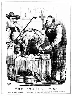 In April 1871, Melbourne Punch was purchased by the McKinley brothers.[21] The new owners were "staunch conservatives" who instigated a campaign in the pages of their magazine against the protectionist liberal faction that had become dominant in the Victorian Legislative Assembly. With the change in ownership and the overt adoption of an anti-liberal stance by Melbourne Punch, "Carrington's graphic satire burst into full bloom".[22]
