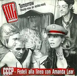 • Italian punk rock band CCCP Fedeli alla linea has recorded a cover of the song, produced by Mauro Pagani, which was released as "Tomorrow (Voulez-vous un rendez-vous)" by Virgin Records in 1988.[13] Amanda has contributed guest vocals to the new version as well as the B-side song, "Inch'Allah ça va". Magazine Music & Media has described the new version of "Tomorrow" as "a slice of mischievous European pop".[14] A music video for the song was made, which largely consisted of footage of the band performing live accompanied by Lear, set to the studio version of the song. The cover was not included on any of the band's studio albums, and only appeared on their 1994 retrospective double CD Enjoy CCCP, and later on Lear's 2002 compilation DivinAmanda.