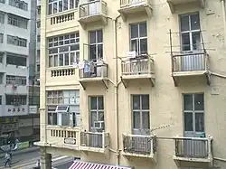 Early tong lau buildings were generally long and narrow with a width of between 12 and 15 feet (3.7 and 4.6 m), determined by the length of the wooden beams.[1] In Hong Kong's building regulations, tong lau refers to a building with any living space intended for more than one tenant.[2] It is essentially a tenement building for residential and commercial use. The ground floor is reserved for commercial use, mostly by small businesses like retail shops and food vendors. The upper floors are for residential use, and cater to Chinese residents of Hong Kong.