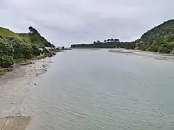 At the river mouth, there are Māori petroglyphs in some caves in the cliffs, including one which shoes a six-toed foot.[2] This location is also very near the Three Sisters and Elephant Rock seastacks.