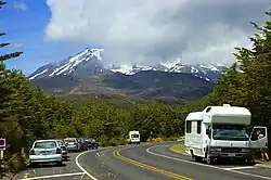 The first motor vehicle reached Whakapapa village via the Bruce Road in August 1925, after the previous rough cart track was upgraded by prison labour and a bridge was built over the Whakapapa River.[46] This led to an influx of tourists and demands for more accommodation at Whakapapa.[47] The hotel Chateau Tongariro at Whakapapa opened in 1929 with 95 bedrooms and associated cheaper lodges for trampers.[48] The road was extended beyond Whakapapa Village after World War 2.[49] Road access to the park was further improved in the 1960s with the development of roads needed for building the Tongariro Power Scheme.[50]