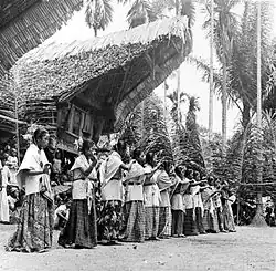 Tongkonan is the traditional ancestral house, or rumah adat, of the Torajan people in South Sulawesi, Indonesia. Tongkonan has a distinguishing boat-shaped and oversized saddleback roof. Like most of the Indonesia's Austronesian-based traditional architecture, tongkonan is built on piles. Its construction is a laborious task, and it is usually built with the help of all family members or friends. In the original Toraja society, only nobles had the right to build tongkonan. Commoners live in smaller and less decorated homes called banua.