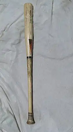 Among Gwynn's primary strengths was his patience in allowing the ball to reach the strike zone before starting his swing.[47] His bats were as small as anyone used during his career, and their lightness allowed him to wait longer before committing to his swing; he was rarely fooled by a pitch.[47] According to Adam Dunn, Gwynn was the only left-handed batter who could successfully hit Hall of Fame pitcher Randy Johnson's slider.[201] Gwynn started with a 34-inch (86 cm), 32-ounce (910 g) aluminum bat in college. As a junior, he had to replace it after it got dented, and came across a 32-inch (81 cm), 31-ounce (880 g) model that was more to his liking.[202] At his first minor league stop at Walla Walla, the shortest bat they had was 34 inches (86 cm). To Gwynn's surprise, he uncharacteristically started hitting home runs. On their first road trip to Eugene, Oregon, he acquired a couple of 32-inch (81 cm) bats that he could better handle.[54][58] In the first 12 years of his MLB career, Gwynn used a 32+1⁄2-inch (83 cm), 31-ounce (880 g) bat. In his final eight years, he employed a 33-inch (84 cm), 30+1⁄2-ounce (860 g) bat,[d][21][47] adding the 1⁄2 inch (1.3 cm) to improve his coverage on the outside of the plate.[21][204] Gwynn's preferred bat material was wide-grain ash wood.[205] He wanted his wooden bats light like his aluminum ones in college. Instead of having the barrel of his bats shaved, as many batters do, he had them "cupped", with the end of the barrel hollowed out like the bottom of a wine bottle.[203] His small hands required that he use thin-handled bats.[47] His bat control made him a good hit-and-run batter,[206] although some former teammates complained he would swing for a hit even when a player was trying to steal, depriving his teammate of a stolen base.[207][208]