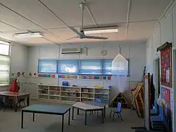 The building was soon extended. In September 1953, plans for a single classroom addition to the east of the 3-classroom building were drawn and the work subsequently performed. This addition matched the existing building and included a second staircase to the verandah.[68] In October 1955, plans were drawn for two more classrooms to be added to the east of the previous addition. These were built sometime in 1956 and were slightly different to the earlier classrooms. Windows in the southern walls were awning windows instead of casements; external cladding extended to ground level on the south and east sides, forming a semi-enclosed play space beneath; bag racks were built instead of verandah balustrades; and instead of a hat room, the east end of the verandah was enclosed with a glazed screen.[69][70][1]