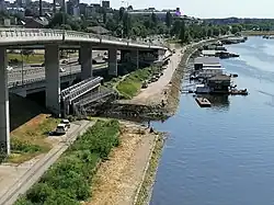 Due to the road, bridge and interchange construction, the section of the river was moved 20 m (66 ft) to the east. As this is the location where the stream of Kaljavi Potok flows into the Topčiderka, its mouth was also moved while the final 100 m (330 ft) of its flow were conducted underground, through the pipes. The new bridge is 19 m (62 ft) long and 26 m (85 ft) wide, with three lanes in each direction.[14] The works on the relocation of the river began on 1 March 2018,[15] and were finished by August 2019.[16] The bridge became operational on 22 March 2019.[17] Further widening of the boulevard along the river began in the late summer of 2019, and was set to finish in the spring of 2021, but the deadline was moved to September 2021, then to May 2022,[18] and to October 2022,[19] before the deadline was moved for the summer of 2024.[20] In October 2023 mayor Aleksandar Šapić blamed the Russian invasion of Ukraine for further delays.[21]