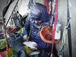 Andy Kirkpatrick updating the topo while on the aid climbing route Tribal Rite (5.8, A3+), El Capitan.