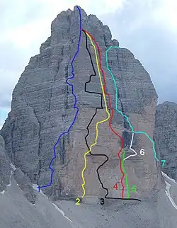 Basic topo of the big wall climbing routes on the north face of the Cima Ovest of the Tre Cime di Lavaredo