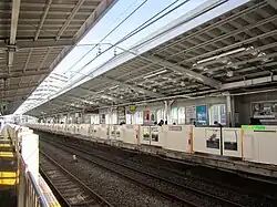 This elevated station consists of two opposite side platforms serving two tracks. This local station can only accommodate trains up to eight cars long.[1]