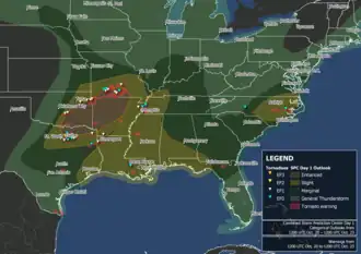 The first signs of organized severe weather across the South Central United States came on October 16, when the Storm Prediction Center (SPC) first delineated a risk area across portions of northern Texas, eastern Oklahoma, and adjacent portions of Kansas, Missouri, and Arkansas.[4] In their day 3 outlook on October 18, the organization introduced a broad Marginal risk for much of the same areas.[5] A small Slight risk was added across northeastern Texas, southeastern Oklahoma, and western Arkansas on October 19,[6] but as confidence in a higher-end event increased, these same areas were raised to an Enhanced risk.[7] In advance of the outbreak, the SPC monitored several weather features of interest. In the upper levels of the atmosphere, an upper-level trough was expected to amplify as it progressed eastward into the U.S. Plains, providing increasing wind shear throughout the region. Simultaneously, a low-pressure area and associated cold front were anticipated to shift eastward across an unstable environment, leading to the formation of severe thunderstorms. Forecasters noted that while the overall environment supported the potential for significant (EF2+) tornadoes, questions about whether storms would be supercellular or instead evolve into a quasi-linear convective system prevented the addition a significant risk area.[7] By the late afternoon hours of October 20, thunderstorms began to develop across eastern Oklahoma within a rapidly moistening environment.[8] At 7:58 p.m. CDT, the first tornado watch was issued across the Ark-La-Tex region;[9] several more watches were introduced over subsequent hours.[10] A pair of long-tracked supercells developed across Tarrant and Johnson counties, intersecting a very unstable regime and producing significant tornadoes as a result.[11] A squall line formed along the cold front farther west, producing a wide swath of damaging winds and additional tornadoes as it tracked across the South-Central United States.[12][13]