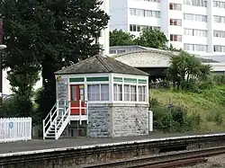In connection with the doubling of the line Torquay Gas House Signal Box was opened here on 24 July 1910. In addition to controlling the entrance to the gas works was used to increase the capacity of the line on busy days until 4 December 1966.