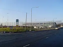 The centre was built on old red blaes (gravel) playing fields used by Queen's Park Secondary School (closed 1994); some of the land may have been contaminated with toxic chromium waste from a local chemical works. The culverted Malls Mire Burn flows beneath the site. A large supermarket and a regional police headquarters are located nearby.