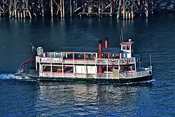 The M.V. Columbia Gorge is a 145-foot (44 m) sternwheeler in service on both the Columbia and Willamette Rivers. She was built in Hood River by Nichols Boat Works and was launched on August 30, 1983.[15] The motors driving her 17-foot (5.2 m) paddle wheel are diesel-powered.[2][15] She was partially modeled on the 1890-built Bailey Gatzert and is named for the Columbia River Gorge. She was built for the Port of Cascade Locks, at a cost of around $2.5 million, of which $1.1 million was funded by federal grants secured by U.S. Senators Mark Hatfield and Bob Packwood, with a goal of boosting tourism in the area.[15] After some delay in obtaining certification from the U.S. Coast Guard, Columbia Gorge took her maiden passenger voyage on October 29, 1983.[16] The Port's plans were for the boat to operate on the Columbia River, out of Cascade Locks, during summer months and on the Willamette River, out of Portland during winter months.[16] Her design includes simulated hog chains, described in 1983 by The Oregonian as "upright posts on the top deck [which were] used on vintage boats to keep the hulls from vibrating and the wooden boats from warping", but which on this vessel are for appearance only.[2] She is certified to carry up to 599 passengers.[17] In the late 1980s, at least, M.V. Columbia Gorge followed the same seasonal pattern of operating out of Cascade Locks from mid-June through September and spending the remainder of each year in Portland, cruising on the Willamette, where she was joined by the Rose.[18]