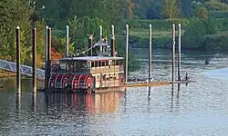 The Willamette Queen, pictured at her dock in Salem, Oregon, has twin paddle wheels.