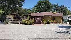Trabuco Oaks Steakhouse's primarily charcoal grills its T-bone, sirloin, and filet steaks, with dishes such as the two- pound Cowboy Steak to the eight-ounce filet mignon.[5] Other selections include chicken, fish and vegetarian entrees, salads, baked beans, french fries as well as a selection of California wines.[5][6] The restaurant is situated in a wooden shack-like building that was constructed around a large tree — its trunk is situated in the dining area. There is no gas in the restaurant.[4][6]