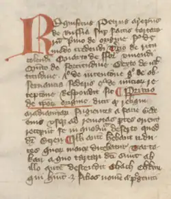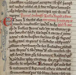 The information in the Tractatus represents the answers given by a certain Russian bishop named Peter to questions posed to him by Pope Innocent IV and the cardinals late in 1244 in advance of the First Council of Lyon.[5][6] Peter is not known from any other source. Every version of the Tractatus refers to him as "archbishop of Russia" (archiepiscopus Russiae) except the Linz manuscript, which specifies him as archbishop of Belgorod (archiepiscopus de Belgrab).[7] Belgorod was in fact a mere diocese, but its bishop frequently acted as vicar for the metropolitan of Kiev.[7][8] The see of Kiev was vacant between late 1240 and the appointment of Cyril II in 1246, which explains why Westerners referred to Peter as an archbishop.[9] Although various identifications have been put forward in the past, the identification of Peter with a previously unidentified bishop of Belgorod is now generally accepted.[10] The identification with the Abbot Peter Akerovich is discredited.[7]