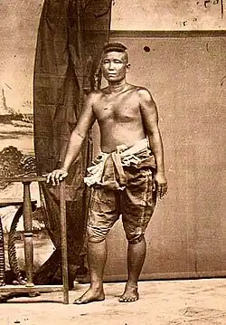 Historically, both Thai males and females dressed themselves with a loincloth wrap called chong kraben.[1]: Note 10 Men wore their chong kraben to cover the waist to halfway down the thigh, whilst women wore their chong kraben down the waist to well below the knee.[2] Members of the nobility wore silk robes called khrui and a tall, pointed hat called lomphok in attendance of royal affairs. Bare chests and bare feet were accepted as part of the Thai formal dress code, and are observed in murals, illustrated manuscripts, and early photographs up to the middle–1800s.[2] Prior to the 20th century, the primary markers that distinguished class in Thai clothing were the use of cotton and silk cloths with printed or woven motifs, but both commoners and royals alike wore wrapped, not stitched clothing.[3] Traditional Thai attire changed significantly during the Rattanakosin period.