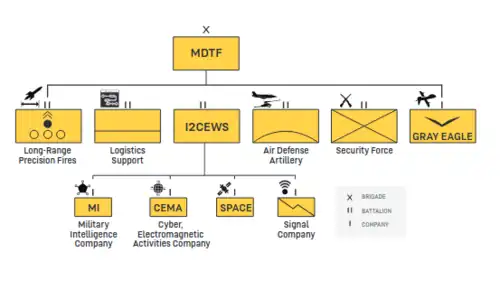 MDTF is a brigade-sized theater-level unit designed to synchronize precision effects and precision fires in all domains against adversary anti-access/area denial (A2/AD) networks in all domains. A MDTF includes two batteries of long-range missiles. One battery, called Mid-Range Capability (MRC), which can fire further than 1,100 miles, has Typhon missile system. The other battery should have the new Long-Range Hypersonic Weapon, whose classified range is likely several thousand miles. A MDTF also includes a HIMARS battery plus air defense battalion, Intelligence, Information, Cyber, Electronic Warfare and Space battalion and support battalion[97][98]