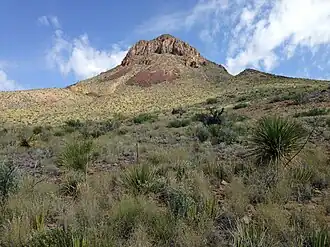 Trap Mountain is part of the Chisos Mountains where it is set in the Chihuahuan Desert and Big Bend National Park. The mountain is composed chiefly of Burro Mesa Rhyolite (volcanic rock) which formed 29 million years ago during the Oligocene period.[4][5] Based on the Köppen climate classification, the mountain is located in a hot arid climate zone with hot summers and mild winters.[6] This climate supports plants on the slopes such as creosote bush, ocotillo, lechuguilla and yucca.[7] Any scant precipitation runoff from the peak's slopes drains to the Rio Grande which is six miles to the southwest. Topographic relief is significant as the summit rises 1,300 feet (396 m) above Ross Maxwell Scenic Drive in one-half mile (0.8 km). The mountain's toponym has been officially adopted by the United States Board on Geographic Names,[3] and has been listed in publications since at least 1914.[8] The mountain's name refers to trap rock,[7] which is any dark-colored, fine-grained, non-granitic intrusive or extrusive igneous rock. There are several large areas of dark rock on the west slope of the mountain visible from the Mule Ears Overlook below Trap Mountain.