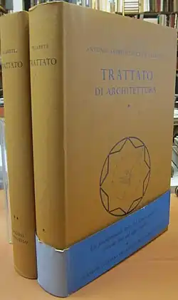 In 1890 von Oettingen published the first draft of the book, and latter added an introduction by Lazzarom and Munoz in 1908. In 1963, Tigler, published his dissertation and book "Die Architecturtheorie des Filarete."[4] Further, an English translation and a critical edition in Italian were published in 1965.[1]
