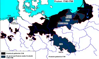Prussian annexations under King Frederick II: Silesia in 1742, East Frisia in 1744, Royal Prussia with Netze District during the First Partition of Poland in 1772, Mansfeld in 1780