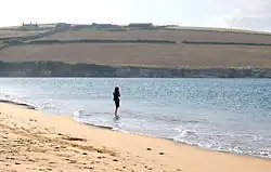 Tregirls beach (which takes its name from the settlement) is 500 metres north at grid reference SW 911 769. The north-facing beach is in the River Camel estuary and is backed by dunes with a small stream trickling across the sand at low tide from the corner of the beach tucked hard behind Stepper Point known as Harbour Cove.[3][4] Beyond Harbour Cove towards Stepper Point is Hawkers Cove, previously the location of the RNLI Padstow lifeboat,[5] now too shallow even at high tide and dry sand at low tide, the result of the sands shifting over the years. The South West Coast Path runs behind the beach[6] before climbing above the rocky side of the river at Hawkers Cove on its way to the Daymark on Stepper Point.