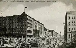 The original hotel's building was built in 1833. It was a three-story wooden structure located at the northwest corner of the intersection of Lake Street and Dearborn Street. It was lost to a fire in 1839.[1] It took its name from the Boston Tremont House.[2] It was later recounted by a reporter that he recalled the hotel having been a three-story frame structure approximately 80 ft (24 m) long and 70 ft (21 m) wide.[3]