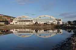 The airport was situated at Skattøra in what was then Tromsøysund Municipality, in today's Tromsø, some 6 kilometers (3.7 mi) north of the city center.[3] The predominant structure at the airport was the twin hangar building. It consists of two concrete arch triplets which carry the roof. Inside the hangar is split in two with a reinforced wall. The structure measures 2,000 square meters (22,000 sq ft).[41] There were two slipways, one falling down from the hangar and one further north.[45] There was a 63-meter (207 ft) pier which ran out from the airport, with a small building at the end.[46] A reinforced wall was built to protect aircraft from attack.[42]
