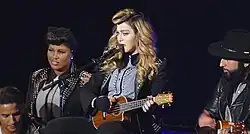 On the Rebel Heart Tour, the song was re-worked in an acoustic doo-wop style, with Madonna playing the ukelele from atop a tire stack.[88][89] The stage resembled a gas station, while the backdrop screen displayed a crescent moon.[90] To Michael Lallo from The Sydney Morning Herald, it was, "perhaps the most joyous moment of the evening".[91] The performance of the song at the March 19–20, 2016 shows in Sydney's Allphones Arena was recorded and released on the artist's fifth live album, Rebel Heart Tour (2017).[92]