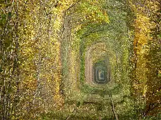 The Tunnel of Love (Ukrainian: Тунель Кохання, romanizedTunel Kokhannia) is a section of industrial railway located near Klevan, Rivne Oblast, Ukraine, that links it with Orzhiv. It is a railway surrounded by green arches[1] and is three to five kilometers in length. It is known for being a favorite place for couples to take walks since trains pass thrice a day.[2]